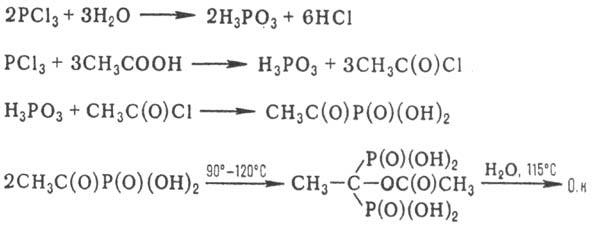 Процесс осуществляют в периодич. или непрерывном режиме. В качестве побочных продуктов в незначит. кол-вах образуются фосфорсодержащие олигомеры и полимеры. Выход оксиэтилидендифосфоновой кислоты достигает ок. 80%. Выход повышается в присут. (СН3СО)2О.