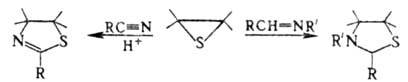 В присут. электрофилов или при нагр. олефинов тиооксиды вступают в р-ции с непредельными соед.: с нитрилами в присут. сильных к-т или к-т Льюиса образуют тиазолины, с азометинами и гидразонами -тиазолидины, напр.: