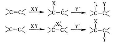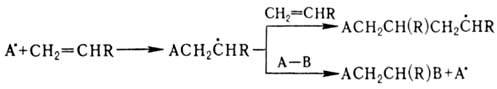 Для олефинов характерны также р-ции радикального присоединения по двойной связи. При взаимод. олефинов со своб. радикалом может идти полимеризация по цепному механизму (см. Цепные реакции, Радикальная полимеризация)или присоединение: