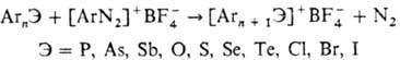 В случае малостабильных оксониевых и особенно галоген-ониевых соед. р-цию проводят в присут. BF3 или SbF5 при полном отсутствии влаги. Общий способ получения ароматических ониевых соединений-термолиз тетрафтороборатов арилдиазониев (или арилгалогенониев) в среде их предшественников (соед. общей ф-лы АrnЭ), напр.: