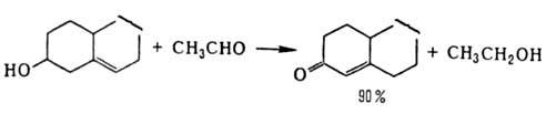 При окислении первичных спиртов их целиком переводят в алкоголяты и дегидрируют действием альдегида, кипящего при т-ре на 50 °С выше продукта р-ции, отгоняя последний из реакц. массы, напр.: