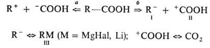 Реагентами, эквивалентными синтонам I и II, могут служить соотв. металлоорг. соед. III и СО2, а реальными р-циями, отвечающими такой разборке,-р-ции 10 и 11: