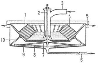Рис. 2. Многополочный сгуститель: 1-бортик; 2-вал скребкового механизма; 3 - трубопровод для подачи сточной воды; 4 - многополочный блок; 5-лоток для отвода осветленной воды; 6 - трубопровод для отвода сгущенного концентрата; 7-рассекатель потока воды; 8 скребковый механизм; 9-коническое днище; 10-подкос для поддержки многополочного блока.