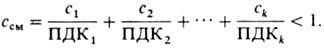 Контроль за качеством воздушной среды имеет важное значение, т. к. выбросы в атмосферу в разл. странах достигают значит. размеров. Так, в 104 городах СССР загрязнение воздуха в отдельные дни в 10 раз превышало установл. нормы (1988). Для такого контроля используют след. показатели: ПДКр.з. - предельно допустимая концентрация хим. в-ва в воздухе рабочей зоны, мг/м3; ПДКм.р. , ПДКс.с.- соотв. макс. разовая и среднесуточная предельно допустимые концентрации хим. в-ва в воздухе населенных мест, мг/м3. В зависимости от значения ПДК хим. в-ва в воздухе классифицируют по степени опасности (см. Токсичность). При одноврем. присутствии в атмосфере k вредных в-в (с концентрациями c1 c2, ..., сn)однонаправл. действия их безразмерная суммарная концентрация не должна превышать 1: