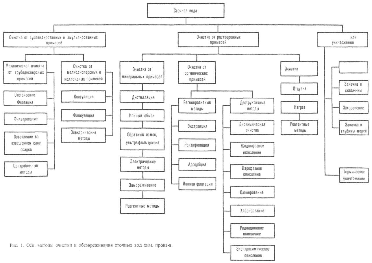 Мех. методы используют для предварит. очистки сточных вод. Хим. и физ.-хим. методы очистки применяют раздельно, а также для достижения наиб. эффекта в сочетании с мех. и биохим. методами; физ.-хим. очистка благодаря определенным преимуществам (см. ниже) м. б. использована вместо биохимической. Классификация осн. методов очистки приведена на рис. 1.