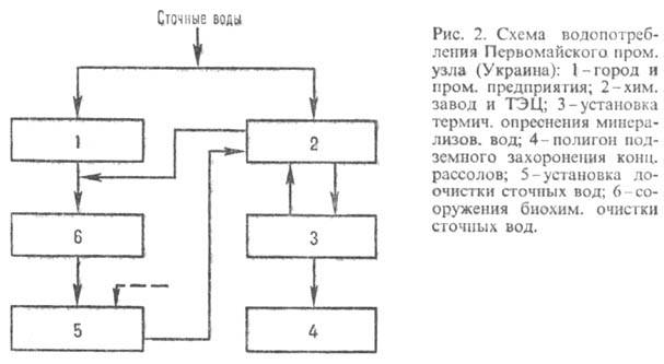В качестве примера правильного учета упомянутых факторов, охраны и рационального использования водных ресурсов служит осуществленная в Первомайском пром. узле (Украина) замкнутая система водопотребления (рис. 2). В нее включены сточные воды города, ТЭЦ, хим. завода и иных пром. предприятий. В каждом хим. произ-ве предусмотрены самостоят. водооборотные циклы с локальными очистными установками и повторное использование очищенных стоков. На общезаводских сооружениях проводится биохим. очистка сточных вод предприятий пром. узла, а также городских вод. Минерализов. воды опресняют на термич. установке, а концентрир. рассолы захороняют в подземные скважины. Отходы после очистки сточных вод и отходы хим. произ-ва перерабатывают с получением белково-вита-минного концентрата, азотных удобрений, Na2SO4, поли-винилхлоридных плиток. В результате потребление пром. узлом свежей воды снизилось в 6 раз, а загрязнение водоемов сведено к минимуму.
