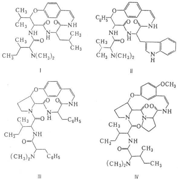 Различают пептидные алкалоиды, содержащие 13-, 14- и 15-членные кольца. Наиб. многочисл. группу алкалоидов с 14-членным кольцом делят на типы: 1) франгуланина (ф-ла I); 2) интегеррина (II); 3) амфибина-Б (III). Для алкалоидов 1-го типа характерно наличие группировки простого эфира, образованного n-гид-роксистириламином и b-гидроксилейцином. Аминокислоты, входящие в их состав, имеют, как правило, липофильный характер, напр. лейцин, изолейцин, фенилаланин. Характерная черта алкалоидов 2-го типа наличие в их кольце остатка фенилсерина. Алкалоиды 3-го типа отличаются присутствием в их молекуле фрагмента транс-3-гидроксипролина.