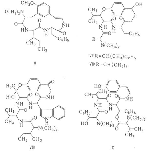 Несколько пептидных алкалоидов нельзя отнести ни к одной из названных групп. Так, в пандамине (VI) и пандаминине (VII) стирила-минная группировка заменена на 2-гидрокси-2-фенетила-минную. Гименокардин (VIII) имеет в своей структуре остаток 4-гидрокси-w-аминоацетофенона вместо остатка стири-ламина, а также фрагменты N,N-диметилизолейцина и триптофана. Лазиодин-А (IX) нециклический пептидный алкалоид; в состав его молекулы входит остаток D-аминокислоты D-mpeo-фенилсерина.