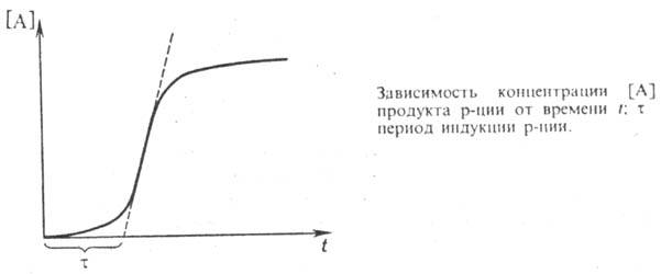 Момент окончания периода индукции всегда несколько условен. Измеряется период индукции приближенно, напр. путем графич. анализа 5-образной кривой зависимости кол-ва продукта А от времени t (см. рис.). В зависимости от механизма р-ции и условий ее протекания (т-ра, плотность или масса реагентов и др. параметры) период индукции меняется в широких пределах-от малых долей микросекунды до суток и более. Данные о периоде индукции помогают понять качеств. и количеств. закономерности кинетики р-ций.
