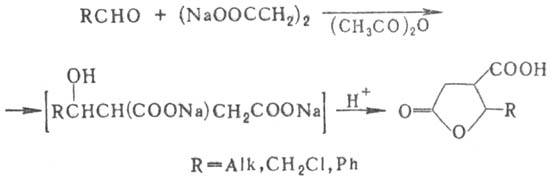 Р-цию ароматич. или алифатич. альдегидов с Na-солью янтарной к-ты или янтарным ангидридом используют для получения параконовых к-т (модификация Fиттига), напр.:
