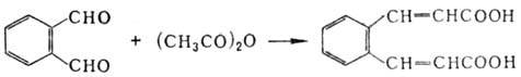 В нек-рых случаях (гл. обр. в зависимости от природы активирующих заместителей в бензольном кольце) арил-этилен (ф-ла I) может стать главным продуктом. Ароматич. диальдегиды (фталевый, изофталевый и тере-фталевый) образуют фенилен-бис-акриловые к-ты, напр.: