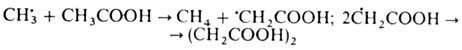 При гомолитич. распаде в р-рителях первичные радикалы могут отрывать атом H от молекулы р-рителя с образованием вторичных радикалов, к-рые димеризуются, напр.: