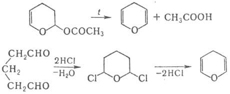 g-Пиран синтезируют пиролизом 2-ацетокси-3,4-дигидропи-рана (3500C) или циклодсгидратацией глутарового альдегида под действием конц. HCl с послед. дегидрохлорирова-нием промежут. 2,6-дихлортетрагидропирана: