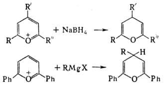 Наиб. разработанные методы получения производных g-пирана-восстановление соответствующих пирилия солей боро-гидридами щелочных металлов или их взаимод. с магнийорг. соед.: