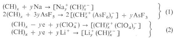 Применяют в основном хим. и электрохим. методы допирования. По первому из них пленки полиацетилена обычно обрабатывают парами допирующего агента или погружают в его р-р. Допирующими агентами служат щелочные металлы, галогены, к-ты Льюиса. По второму методу через р-ры солей пропускают постоянный электрич. ток, используя в качестве электродов пленки полиацетилена. В обоих случаях протекают окислит.-восстановит. р-ции, напр.: