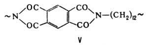 Свойства. Различают полиимиды с алифатич. звеньями в основной цепи макромолекулы и чисто ароматические. Первые - твердые легко кристаллизующиеся в-ва белого или желтого цвета. Полипиромеллитимиды на основе алифатич. диаминов, содержащих менее 7 атомов С в молекуле, имеют высокие т-ры плавления, лежащие выше т-р их начала разложения (выше 3500C); не раств. в известных орг. р-рителях. Полипиромеллитимиды на основе алифатич. диаминов, содержащих в цепи более 7 атомов С или имеющих разветвленную углеводородную цепь (не менее 7 атомов С), а также полиимиды др. ароматич. тетракарбоновых к-т и разл. алифатич. диаминов размягчаются при т-рах 3000C; такие полиимиды хорошо перерабатываются прессованием, литьем под давлением или экструзией; т. стекл. 100-2000C. В аморфном состоянии они хорошо раств. в м-крезоле, сим-тетрахлор-этане, хлороформе, не раств. в ДМФА, ацетоне, бензоле. Из р-ров и расплавов этих полиимидов можно формовать эластичные весьма прочные пленки. Практич. применение находит в качестве кабельной изоляции поли-1,12-додекаметилен-пиромеллитимид (ф-ла V), для пленки к-рого относит, удлинение 300%.