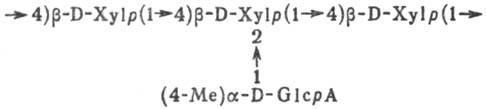 4-О-Метилглюкуроноксилан; (4-О-метил)-a-D-глюкопиран-уроно-b-D-ксилопиранан (Xylp и GlcpA-соотв. остатки ксилозы и глюкуроновой к-ты в пиранозной форме, Me = СН3)