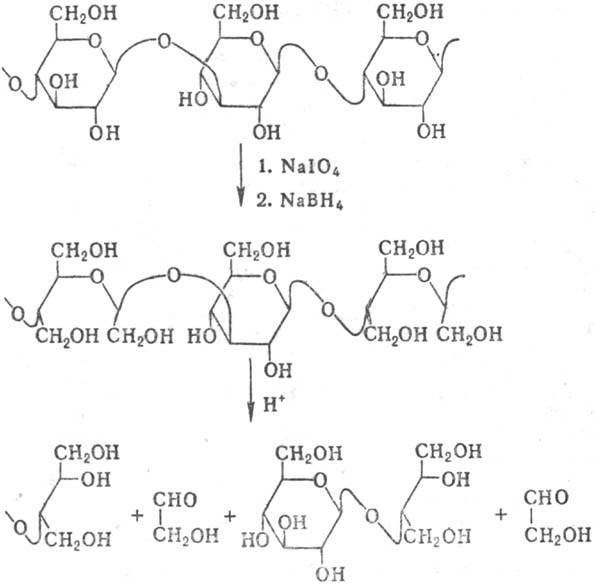 Своеобразный способ фрагментации молекул полисахаридов-расщепление по Смиту, включающее периодатное окисление, восстановление полученного полиальдегида в полиол действием NaBH4 и мягкий кислотный гидролиз, разрушающий ацетальные группировки (но не гликозидные связи моносахаридов, не затронутых периодатным окислением). Метод Смита часто позволяет получить фрагменты молекул полисахаридов, недоступные при обычном кислотном или ферментативном гидролизе (стадия образования полиальдегидов не показана):