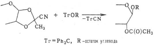 Примером Такой р-ции служит взаимод. цианоэтилидено-вых производных углеводов с тритиловыми эфирами Сахаров, приводящее к 1,2-транс-гликозидам: