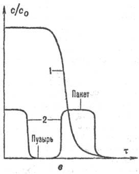 Перенос газа между пузырями и плотными зонами обычно исследуют экспериментально (см. также Переноса процессы). Напр., совмещают локальные кривые вымывания меченого газа-трассёра (см. Трассёра метод)и локальные кривые флуктуации плотности, вызываемые движением пузырей (рис. 2). Сравнение кривых в области слоя, где сформировались большие пузыри, показывает, что в пузырях измеряются миним. концентрации трассёра (плотность слоя также минимальна), а в плотных пакетах-макс. концентрации (плотность максимальна). Чем больше разница концентраций в пузырях и плотной зоне, тем меньше коэф. обмена (обменные потоки газом между разреженными и плотными зонами, отнесенные к единице объема слоя).