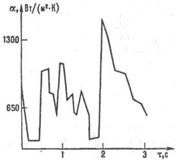 Рис. 3. Мгновенные значения коэффициентов теплоотдачи a от псевдоожиженного слоя к теплообменной поверхности (т-время).