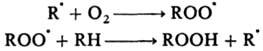 Реакции свободных радикалов с молекулами. Характерны для таких практически важных процессов, как хлорирование, бромирование, сульфохлорированис, автоокисление, полимеризация и др., протекающих по цепному механизму (см. Цепные реакции). Их константы скорости на неск. порядков ниже, чем для рекомбинации; Е = 20-60 кДж/моль. Так, р-ция автоокисления осуществляется в результате многократно повторяющихся р-ций по схеме: