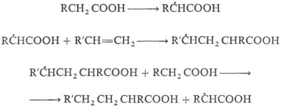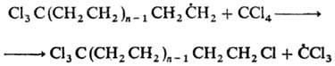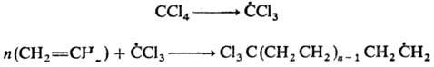 К реакциям свободнорадикального присоединения относится также теломеризация - цепная реакция непредельных соед. в присут. в-в (телогенов), в результате к-рой образуется смесь низкомол. гомологов (теломе-ров). Реакция используется в пром-сти для получения a, a, a, w-тетрахлоралканов из СС14 и этилена и разветвленных карбоновых к-т из пропионовой к-ты и этилена, напр.: