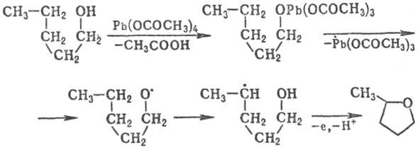 Радикалы могут претерпевать перегруппировки с миграцией атомов и(или) функц. групп. При этом всегда происходит образование более стабильного радикала, чем исходный. Для алкильных, алкоксильных, аминилъных, амидиль-ных радикалов характерна 1,5-миграция атома Н от атома С к радикальному центру. Эта р-ция - ключевая стадия при окислении алканолов в тетрагидрофураны, карбоновых к-т в g-лактоны, метилалкилкетонов в g-дикетоны, напр.: