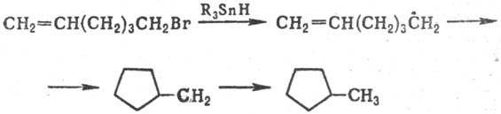 Известно также внутримол. присоединение углерод- или кислород центрированных радикалов к кратным связям или к ароматич. ядру. Таким путем легко образуются 5- и 6-членные циклы, напр.: