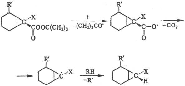 Стереохимия р-ции зависит от характера субстрата. Обычно образующийся радикал с неспаренным электроном у хирального атома С имеет плоскую или близкую к плоской конфигурацию, что приводит к рацемизации. В циклич. системах инверсия радикального центра затруднена, особенно в случае малых циклов, напр.: