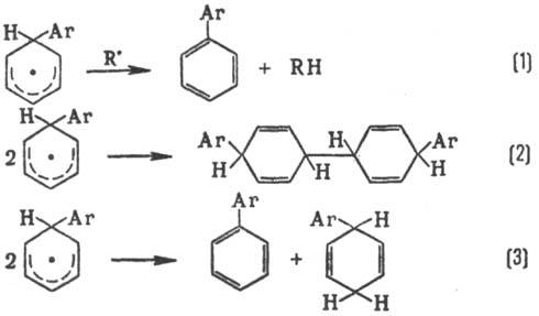 Превращение в конечный продукт происходит в результате отрыва атома Н (р-ция 1); побочные процессы-рекомбинация (2) и диспропорционирование (3):