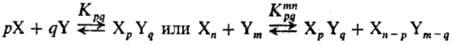 Для р-ции типа X+Y: продукты, где X и Y-соед., способные образовывать Н-связи: вода, спирты, амины, карбоновые к-ты и т. п., характерно участие гомоассоциатов Хn и Ym, а также гетероассоциатов XpYq. Во мн. случаях р-ции между мономерными формами X и Y практически отсутствуют. Имеют место след. равновесия: