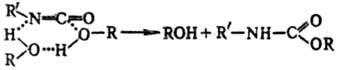 Благодаря ассоциации удлиняются хим. связи, увеличиваются эффективные электрич. заряды на атомах реагентов. Квантовохим. расчет показывает, напр., что в результате димеризации метанола связь О—Н удлиняется на 4%, заряд-на атоме Н увеличивается на 25% и на атоме О-на 14%. Дальнейшая ассоциация приводит к еще большему росту зарядов. Указанные изменения в структуре молекулы, как правило, приводят к увеличению реакц. способности спирта. Помимо этого, меняется сам механизм р-ции в связи с возможностью образования циклич. предреакц. комплексов и циклич. переходных состояний. При этом уменьшаются стерич. затруднения и снижается энергетич. барьер при осуществлении элементарного акта р-ции: разрыв и образование связей в циклич. "заготовке" происходят согласованно (см. Согласованные реакции). Напр., в р-ции ROH + + R'NCO : R'NHCOOR мономер спирта практически не-реакционноспособен и р-ция идет только с участием диме-ров и тетрамеров спирта: