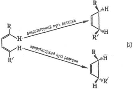 При дисротаторном пути р-ции заместители R и R' в продукте будут расположены по одну сторону плоскости цикла, при конротаторном пути-по разные стороны. Эксперимент показывает, что термич. циклизация производных бутадиена происходит по конротаторному пути, а фотохим. циклизация-по дисротаторному пути.