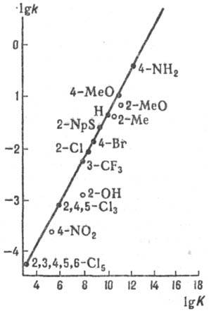 Рис. 5. Корреляция между константами скорости k и константами равновесия К для р-ции SN2 (5) в диметилсульфоксиде при 25 °С. АСН2R - бутилхлорид (А = С1), В- - замещенные фенилтиолят-анионы (указаны заместители), NpS -нафтилтиолят-анион.