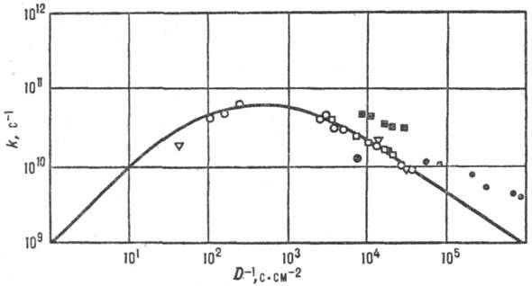 Рис. 7. Корреляция между константами скорости k и козф. диффузии D (фото-хим. изомеризации стильбена в газовой и жидкой фазах при разных давлениях). Значки разл. формы отвечают разным средам; сплошная линия—расчет по ур-нию Крамерса.