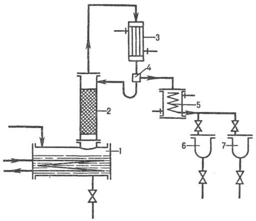 Рис. 5. Ректификационная установка периодич. действия: 1 -куб; 2-колонна; 3-дефлегматор; 4-делитель потоков; 5-холодильник; 6, 7-сборники.