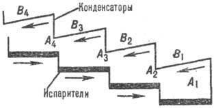 Молекулярная ректификация, наз. также многоступенчатой мол. дистилляцией, используется для разделения смесей малолетучих и термически нестойких в-в. Среди разл. конструкций аппаратов для такой ректификации практич. интерес представляют аппараты лестничного типа, принцип работы к-рых показан на рис. 8. Пары, испаряясь с пов-сти жидкости, напр. на ступени А3, конденсируются на наклонной пов-сти В3, а образующийся конденсат стекает в смежную вышестоящую ступень А4. Избыточное кол-во жидкости из ступени А4 переливается в ступень А3 и т.д., т.е. в аппарате осуществляется противоток жидкости и пара.