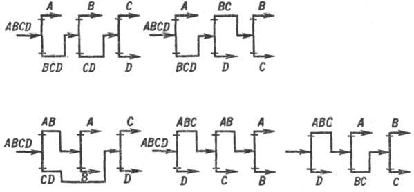 Синтез технологических схем разделения. Для разделения n-компонентной смеси требуется п — 1 колонн, однако число возможных вариантов технол. схем с расчетом числа продуктов и способов их получения увеличивается экспоненциально. На рис. 9 показано, что для разделения смеси компонентов ABCD, расположенных в порядке возрастания т-р кипения, возможны 5 вариантов схем деления; для смеси из 10 компонентов число возможных схем составляет 4862.