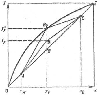 Из рис. 2 следует, что пт определяется положением рабочих линий в обеих частях колонны, к-рое, в свою очередь, зависит от R. На рис. 3 изображено неск. положений рабочих линий, однако существуют два предельных положения: первое-линии СВ для верха и AB для низа колонны, второе-линии СВ2 для верха и АВ2 для низа колонны. Первый предельный случай-бесконечно большое флегмовое число (R = ,; колонна работает "на себя", т. е. вся жидкость, полученная в результате полной конденсации паров в дефлегматоре, возвращается в колонну в виде флегмы; отбор дистиллята и выдача продукта не производятся, что в нормальных производств. условиях исключается; подобный режим удобен только для исследоват. целей), при этом рабочая линия совпадает с диагональю диаграммы. Отрезок b=xD(R+1), отсекаемый рабочей линией ABC на оси ординат, в соответствии с ур-нием (2) равен нулю и, следовательно, изменение рабочих концентраций отвечает ур-нию у = х, т. е. составы пара и жидкости равны в каждом сечении колонны. Второй предельный случай-рабочие линии пересекают равновесную кривую у*=f(х) в точке В2. Ректификация возможна, но поскольку в точке В2 движущая сила равна нулю (у* = у), для проведения процесса потребуется колонна с бесконечно большой пов-стью фазового контакта, работающая при миним. флегмовом числе, к-рое составляет: