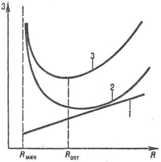 Рис. 4. К определению оптимального флегмового числа: 1-эксплуатац. расходы; 2-капитальные затраты; 3-общие затраты на ректификацию.