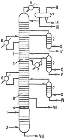 Рис. 11. Установка атмосферной перегонки нефти: 1-осн. колонна; 2-отпарные колонны (секции); 3-тарелка питания; 4-отбойник; 5-конденсатор; 6-холодильник; 7-емкость орошения; 8-рабочие тарелки; I-нефть; II - газ; III -бензин; IV-керосин; V, VI-легкое и тяжелое дизельные топлива; VII-атм. газойль; VIII-мазут; IX—во да; Х-водяной пар.