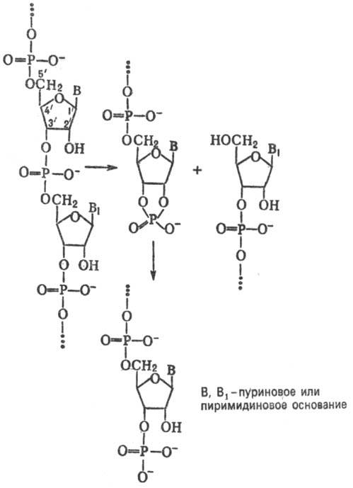 Рибонуклеазы расщепляют только 3',5'-фосфодиэфирные связи поли-и олитонуклеотидов; фосфодиэфирные 2',5'- и 5',5'-связи устойчивы к их действию. Ферменты проявляют специфичность к природе нуклеозидов, образующих фосфодиэфир-ную связь. Наиб. это выражено у циклизующих рибонуклеаз. По специфичности к природе нуклеозида на 3'-конце межнуклео-тидной связи рибонуклеазы делят на пиримидин-, пурин-, гуанозин-специфичные и неспецифичные. Природа нуклеозида на 5'-конце межнуклеотидной связи может также заметно влиять на скорость ее расщепления. Кроме того, все рибонуклеазы проявляют специфичность к макромол. форме РНК, т.е. скорость вызываемой ими деполимеризации существенно зависит от того, находится ли РНК в одно- или двунитевой форме. Для проявления активности циклизующих рибонуклеаз коферментов не требуется; нециклизующие рибонуклеазы активны в присут. ионов двухвалентных металлов (напр., Mg2+). Известны рибонуклеазы, для к-рых в качестве кофермента требуется РНК определенного состава или олигоаденилат с 2',5'-фосфодиэфирными связями.