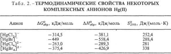 Дигалогениды HgX2 раств. в воде и орг. р-рйтелях, в отличие от большинства др. солей в водных р-рах практически не диссоциируют. В водных р-рах в присут. избытка MX, где М = Na, К, Rb, образуют хорошо р-римые комплексы M2[HgX4]. Константа устойчивости К комплексов [HgX4]2- увеличивается в ряду Сl < Вr < I (К = 15,93, 21,0, 30,17 соотв.; о др. св-вах см. табл. 2). Константы равновесия р-ции обмена HgX2 +