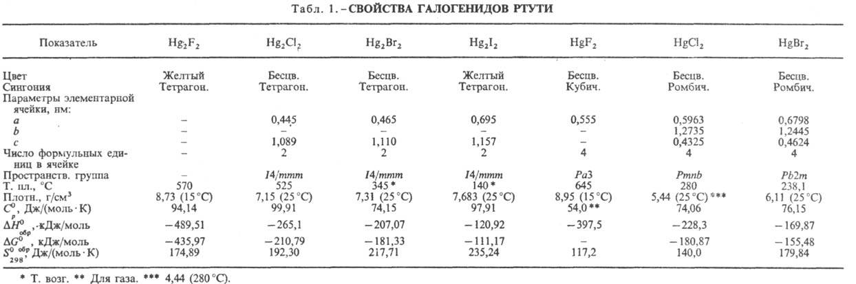 РТУТИ ГАЛОГЕНИДЫ, моногалогениды Hg2X2 и дигало-гениды HgX2. Ртути галогениды -кристаллы (табл. 1). Моногалогениды Hg2X2, где X = Сl, Вr, I, малорастворимы в воде, не раств. в орг. р-рителях. Особенность в хим. поведении Hg2X2-способность ионов