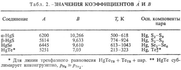 При натр. в вакууме ртути халькогениды легко испаряются, диссоциируя на Hg и X, доля молекул HgX в паре ок. 1·10-4; ур-ние температурной зависимости давления пара HgX: lgp (мм рт.ст.) = -А/Т+ В (табл. 2)