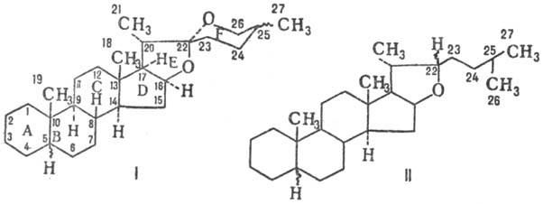 Стероидные сапонины в качестве сапогенинов содержат обычно производные спиростана (ф-ла I) или фуростана (II).