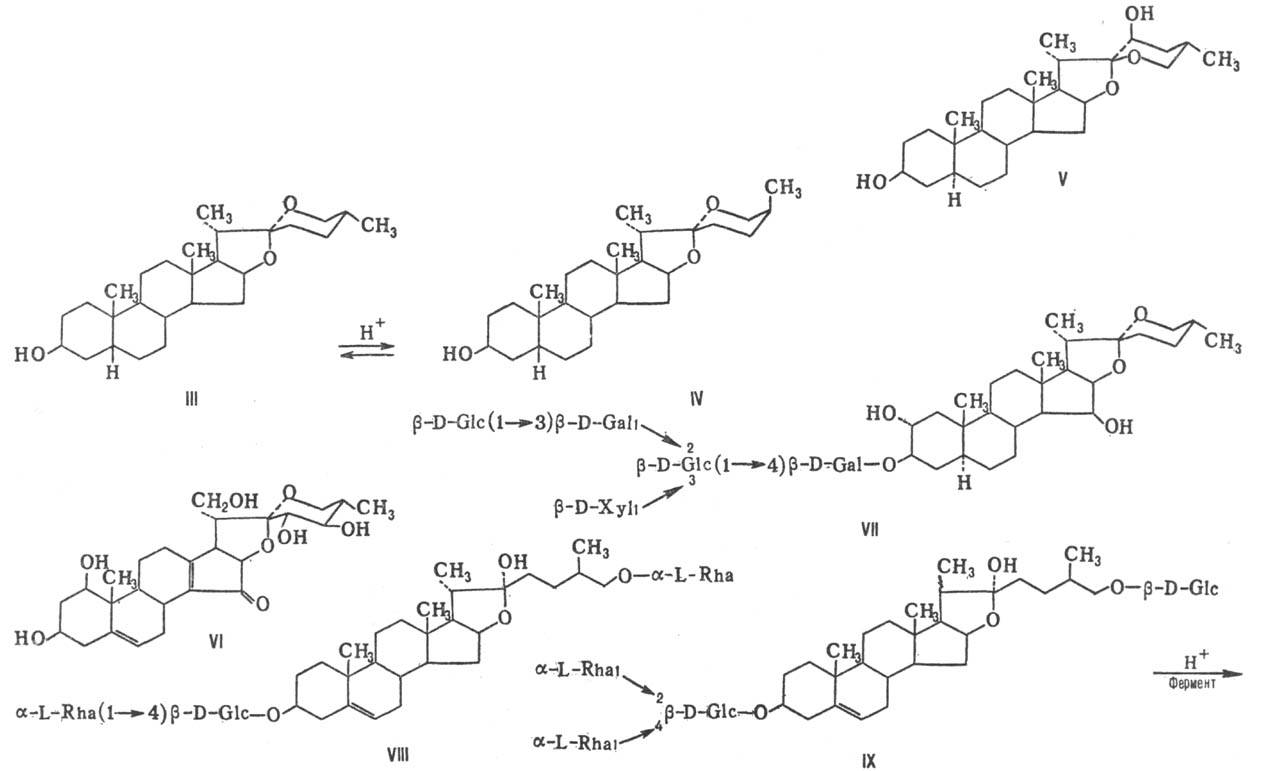 Сапонины ряда фуростана имеют в своей основе скелет соед. II. Как правило, они содержат углеводную цепь при С-3 и остаток D-глюкозы при С-26. Исключение составляет афромон-тозид (VIII; Rha-рамноза). Отщепление остатка сахара от С-26 под действием к-т или ферментов приводит к спиростановым сапонинам, напр. в случае перехода от протодиосцина (IX) к диосцину (X).