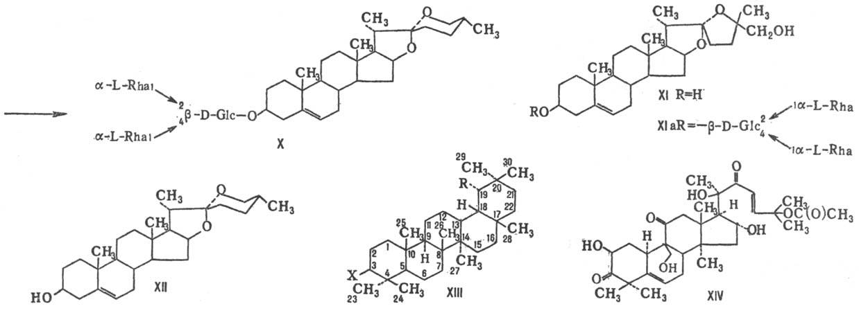 Тритерпеновые сапогенины являются обычно производными олеанана (XIII; X и R = Н) или урсана (ф-ла XIII; X = Н, R = СН3; СН3-29 отсутствует). В природе широко распространены сапонины, сапогенинами к-рых являются амирины (напр., b-амирин, ф-ла XIII, X = ОН, R = Н; в положении 12-13 двойная связь).
