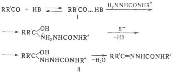 Роль катализатора (к-ты НВ) при получении семикарбазонов сводится к образованию комплекса ф-лы I, к-рый и является активным субстратом (поэтому сильные к-ты не эффективны как катализаторы). При взаимод. этого комплекса со своб. семикарбазидом, частично образующимся в результате р-ции его гидрохлорида с ацетатом Na, получают соединения ф-лы II; последние легко теряют воду, превращаясь в семикарбазоны: